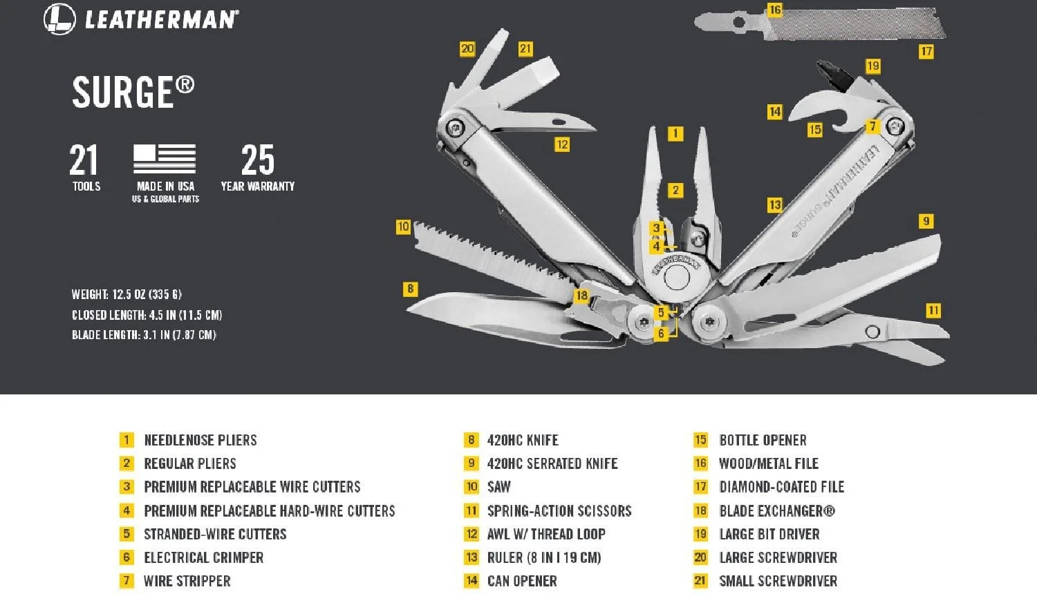 The full feature set on an unmodified Leatherman Surge Multi Tool